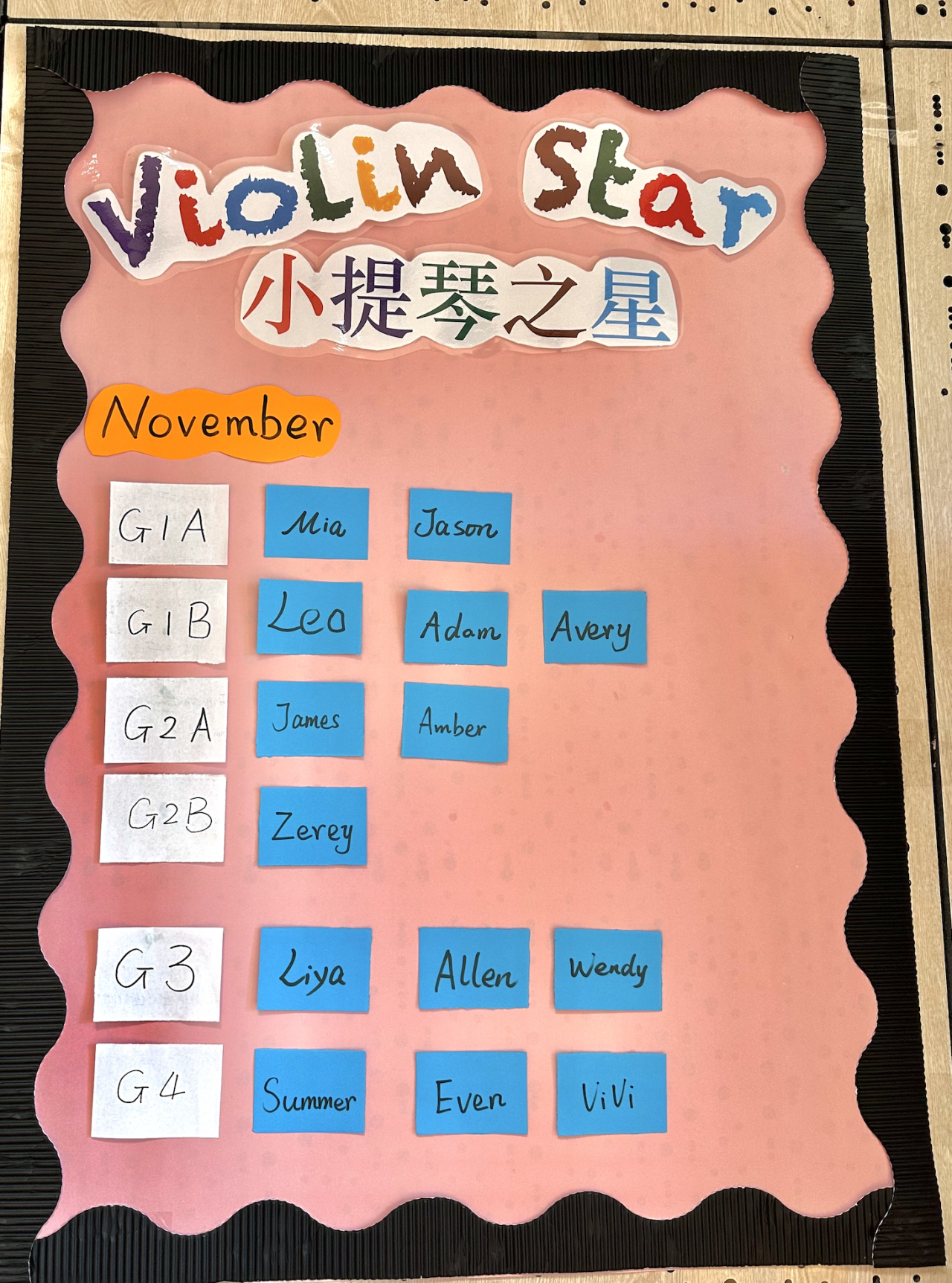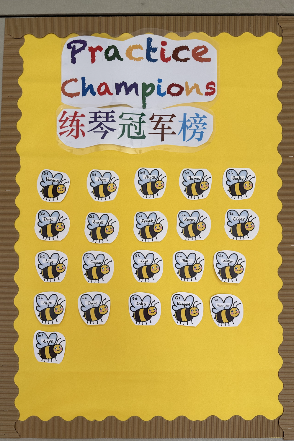 To actively promote the development of good practice habits, Ms Susan launched the “Practice Champion Board.” This initiative encourages students to log and reflect on every practice session, using a card-punching system to visually showcase their hard work and steady progress. Each time a practice task is completed, students earn a “Busy Bee” card symbolising diligence, which is then proudly displayed on the board as a testament to their relentless efforts.