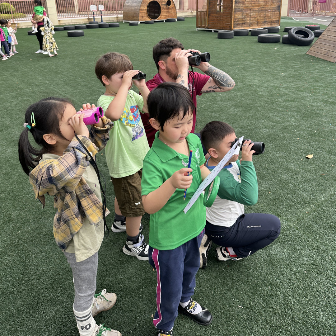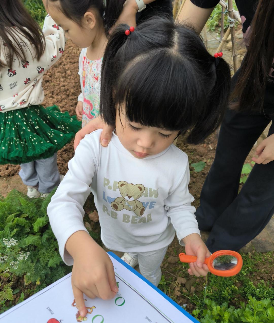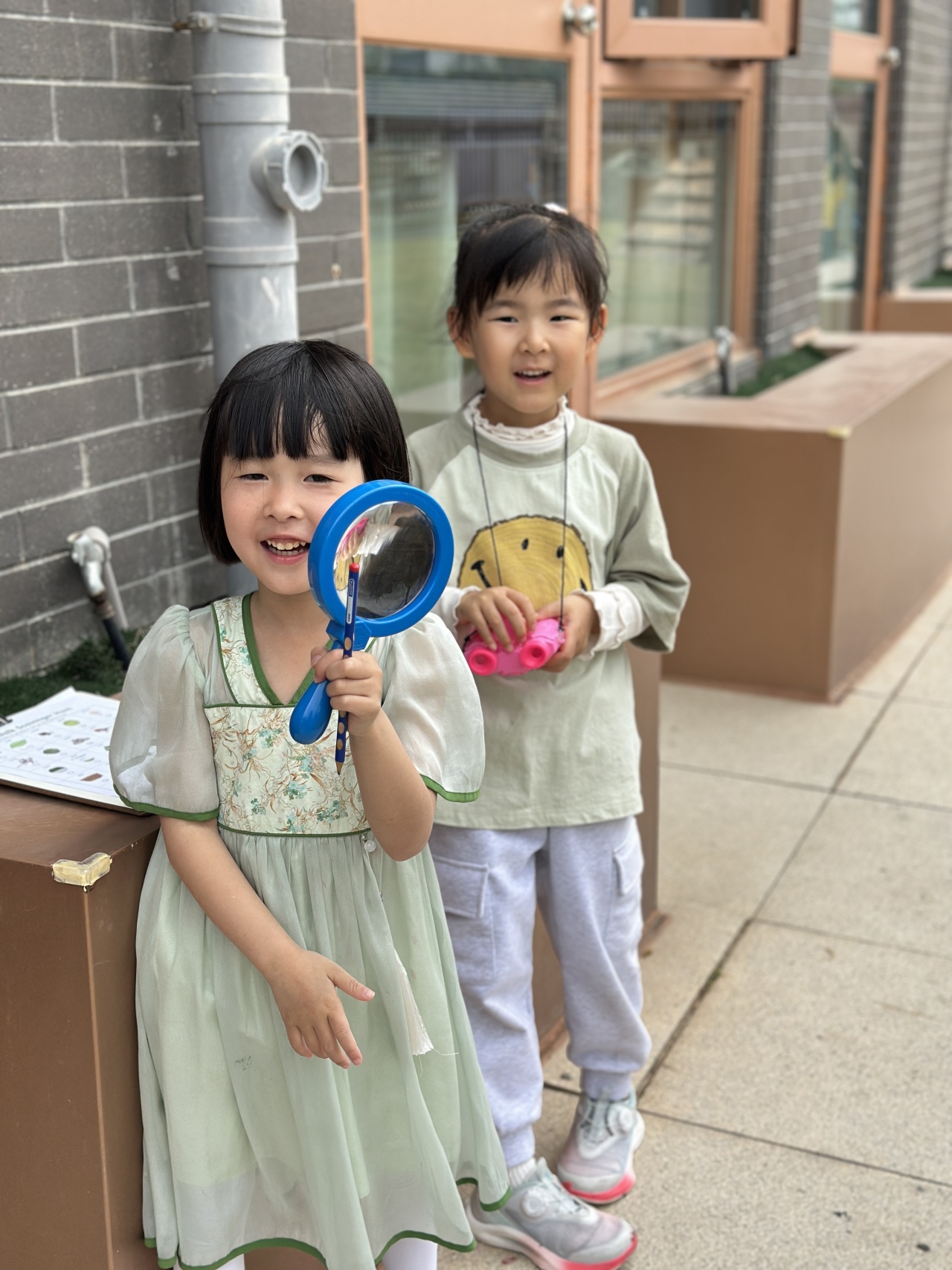 The children first made colourful pinwheels and joyfully flew them outdoors. They also conducted a "Search for Nature" exploration activity within the school grounds, carefully recording the insects and plants they observed in their observation logs. Using magnifying glasses and binoculars, they explored unique organisms up close.