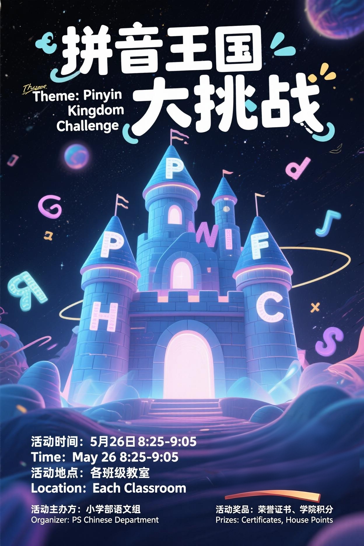 On 26 May, the primary school held the 'Pinyin Kingdom Grand Challenge' event for all grades. The first-grade students performed excellently in this activity! Whether it was the similar sounds of 'ui' and 'iu', or the closely resembling 'ie' and 'ei', most of the children were able to distinguish them accurately. Even the most challenging sounds 'b', 'd', 'p', and 'q' could be recognised by the children with their sharp eyes. After continuous practice, over 80% of the children were able to read fluently and accurately using Pinyin!