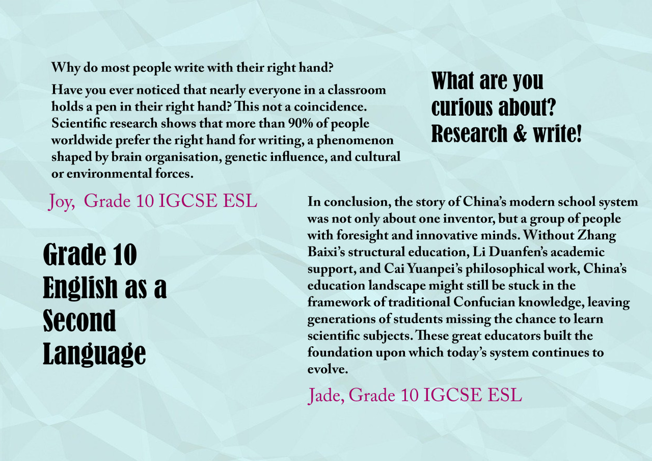 In curriculum design, the school strictly adheres to the principle of tiered instruction by constructing a dual-track system that integrates both IGCSE and IELTS preparation. At the IGCSE level, the EAL curriculum focuses on building vocabulary and grammar fundamentals, fostering clear and fluent expression in English. The ESL curriculum, through systematic training in grammar, reading, and writing, comprehensively enhances students' language comprehension and application skills. The IELTS curriculum is divided into two stages: preparatory and advanced. The preparatory stage emphasises strengthening language foundations and addressing knowledge gaps, while familiarising students with question types and test patterns. The advanced stage concentrates on deepening and refining test-taking strategies, using full-length mock exams to strengthen time management and acclimatization to exam conditions.