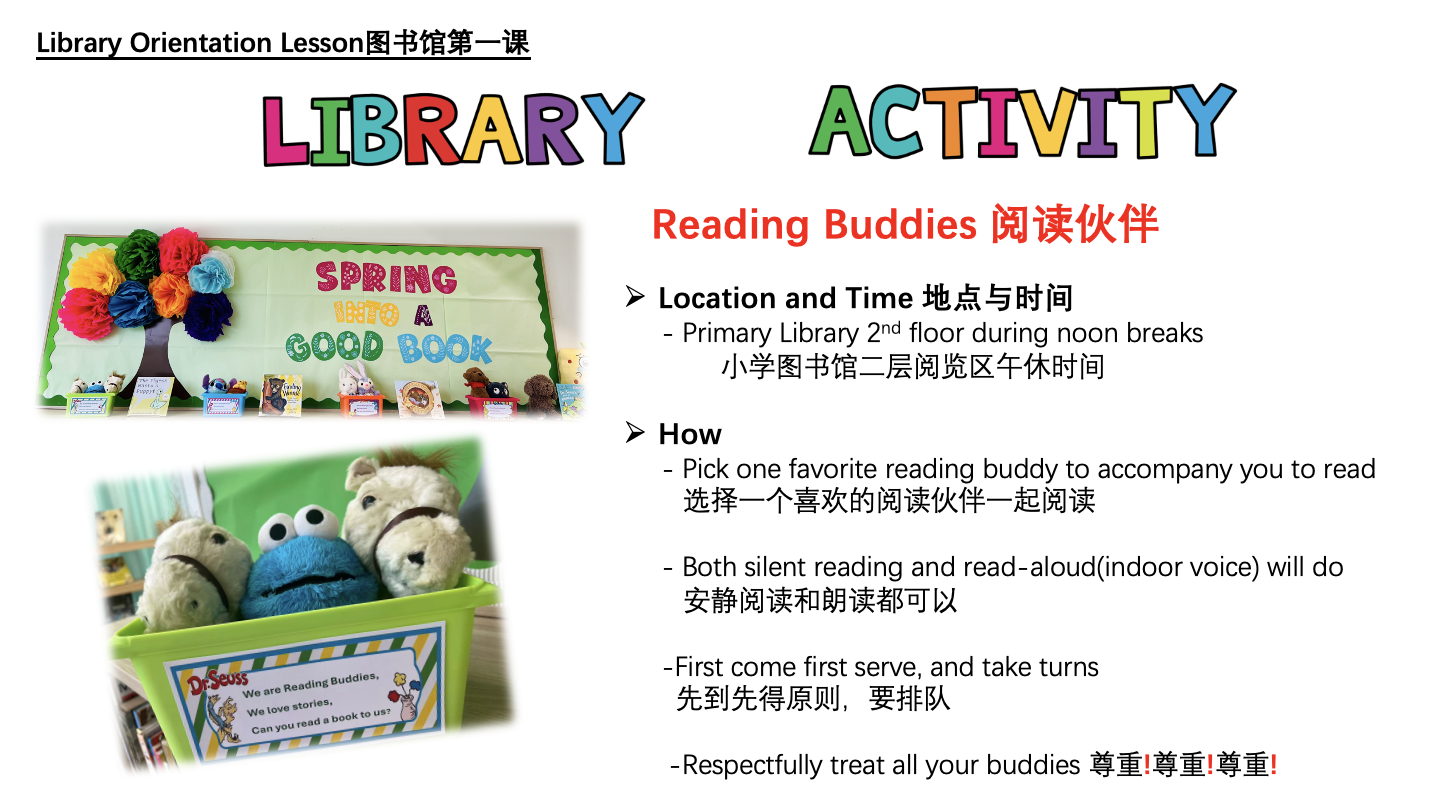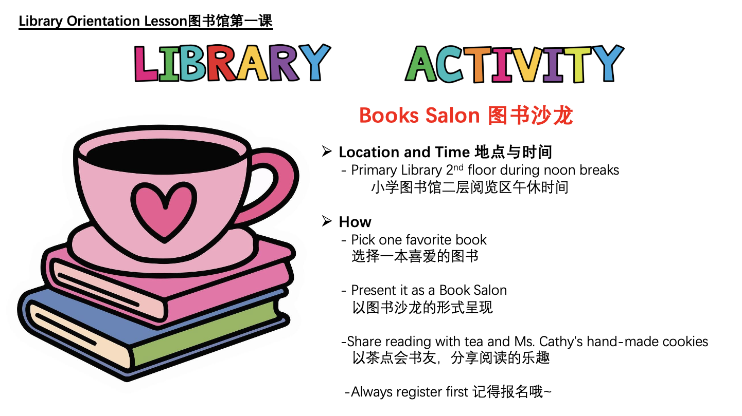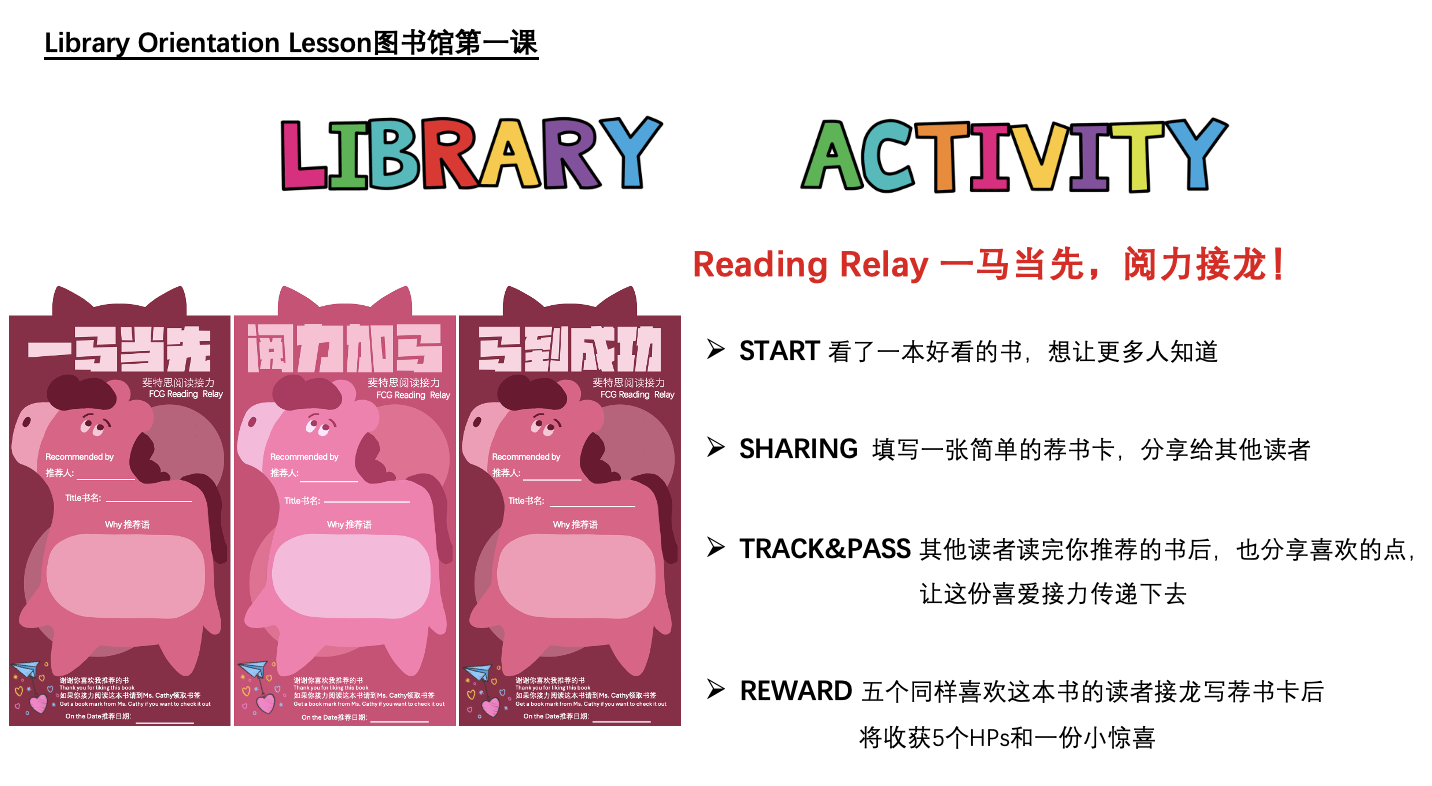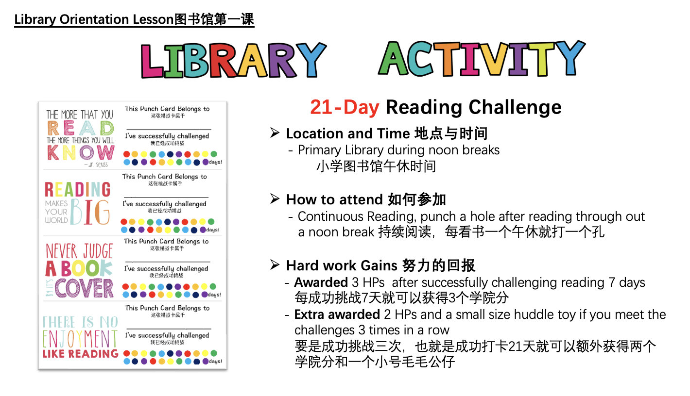 During the first week, we shared these activities with students in the orientation library lesson. In addition to regular monthly Top Patron and the 21-Day Reading Challenge during noon breaks, we designed multi-dimensional reading activities to further develop and expand students’ enthusiasm for reading. New activities include Reading Buddy programmes, Reading Relay activities, and Book Salon sessions, all intended to stimulate students’ creativity and communication skills.